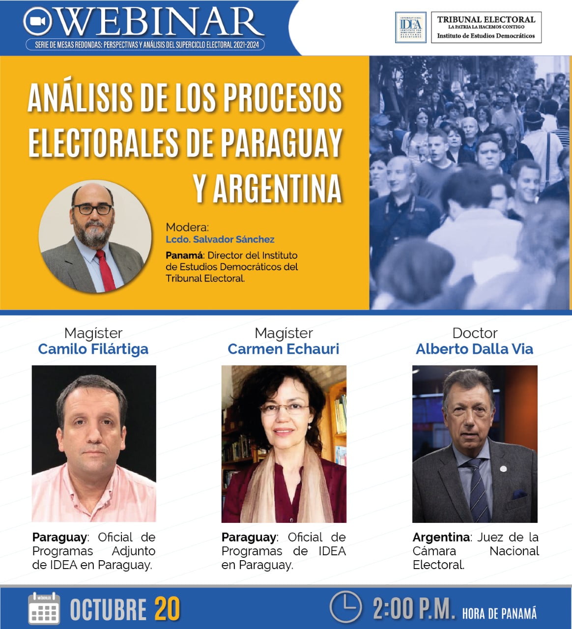 La mesa redonda virtual la conformarán por Paraguay Camilo Filártiga Callizo, abogado por la Universidad Católica de Asunción y magíster en estudios políticos aplicados de la Fundación Internacional y para Iberoamérica de Administración y Políticas Públicas; y la magíster Carmen Echauri, socióloga, con maestría por la Universidad Estatal de Nueva York en Buffalo, y cuenta con especializaciones en derechos humanos y en elecciones y representación política. Ambos son oficiales de programa de organización IDEA Internacional.