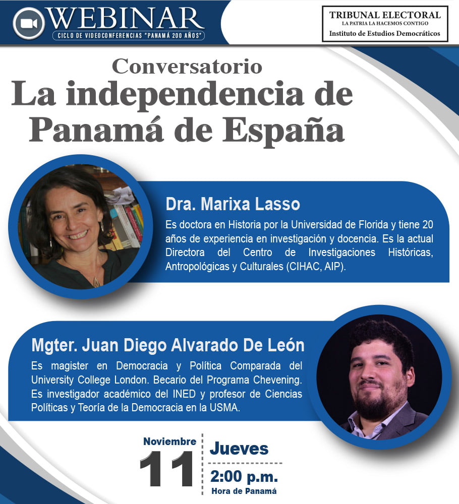 Octavo webinar del Ciclo de videoconferencias “Panamá 200 años (1821 – 2021)”. El conversatorio titulado “La independencia de Panamá de España” contó con la participación de la doctora en Historia por la Universidad de la Florida, Marixa Lasso, profesional con 20 años de experiencia en investigación y docencia, quien es la actual Directora del Centro de Investigaciones Históricas, Antropológicas y Culturales ((CIHAC, AIP). Su contraparte, Juan Diego Alvarado De León, es magister en Democracia y Política Comparada por la University College London. Es investigador académico del INED y profesor de Ciencias Políticas y Teoría de la Democracia en la USMA.