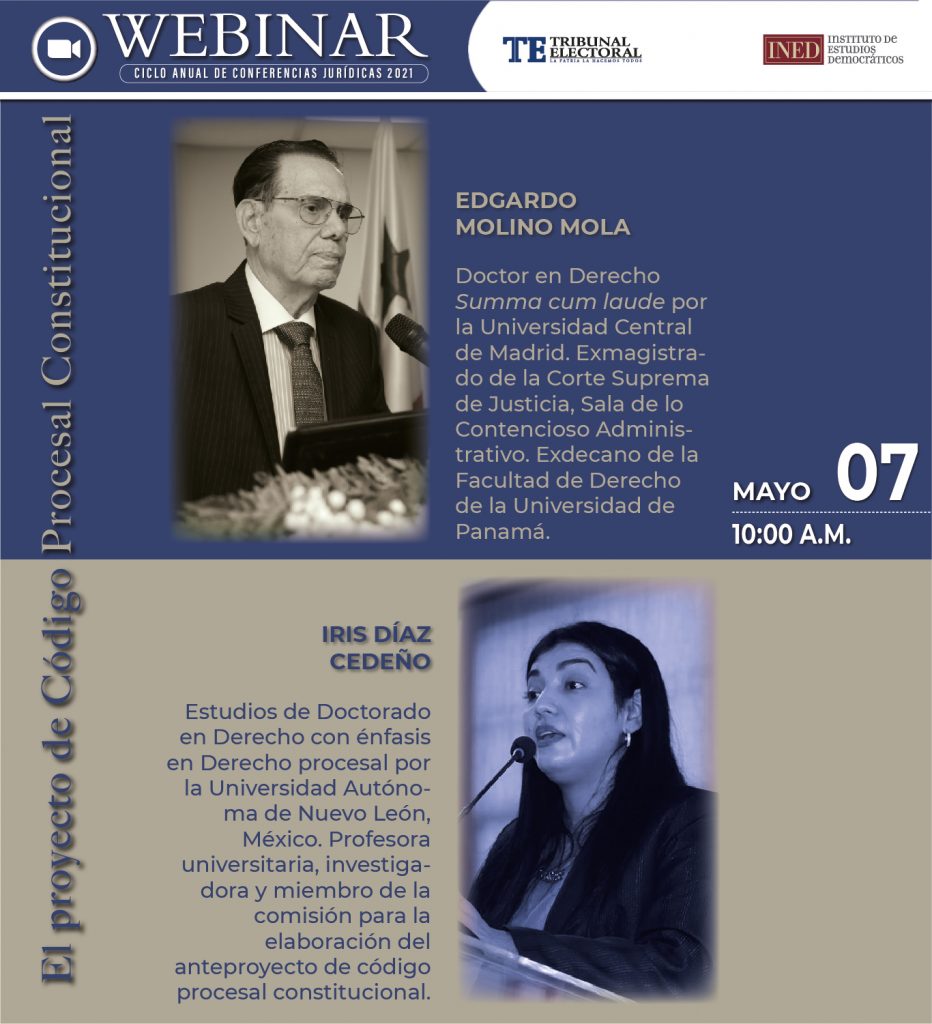 Sexto de los Webinar del Ciclo anual de conferencias jurídicas 2021 .El panel en esta ocasión contará con la intervención de la doctora Iris Díaz Cedeño profesora universitaria, investigadora y miembro de la comisión para la elaboración del anteproyecto de código procesal constitucional, además participará el Exmagistrado de la Corte Suprema de Justicia y Exdecano de la Facultad de Derecho de la Universidad de Panamá, doctor Edgardo Molina Mola.
