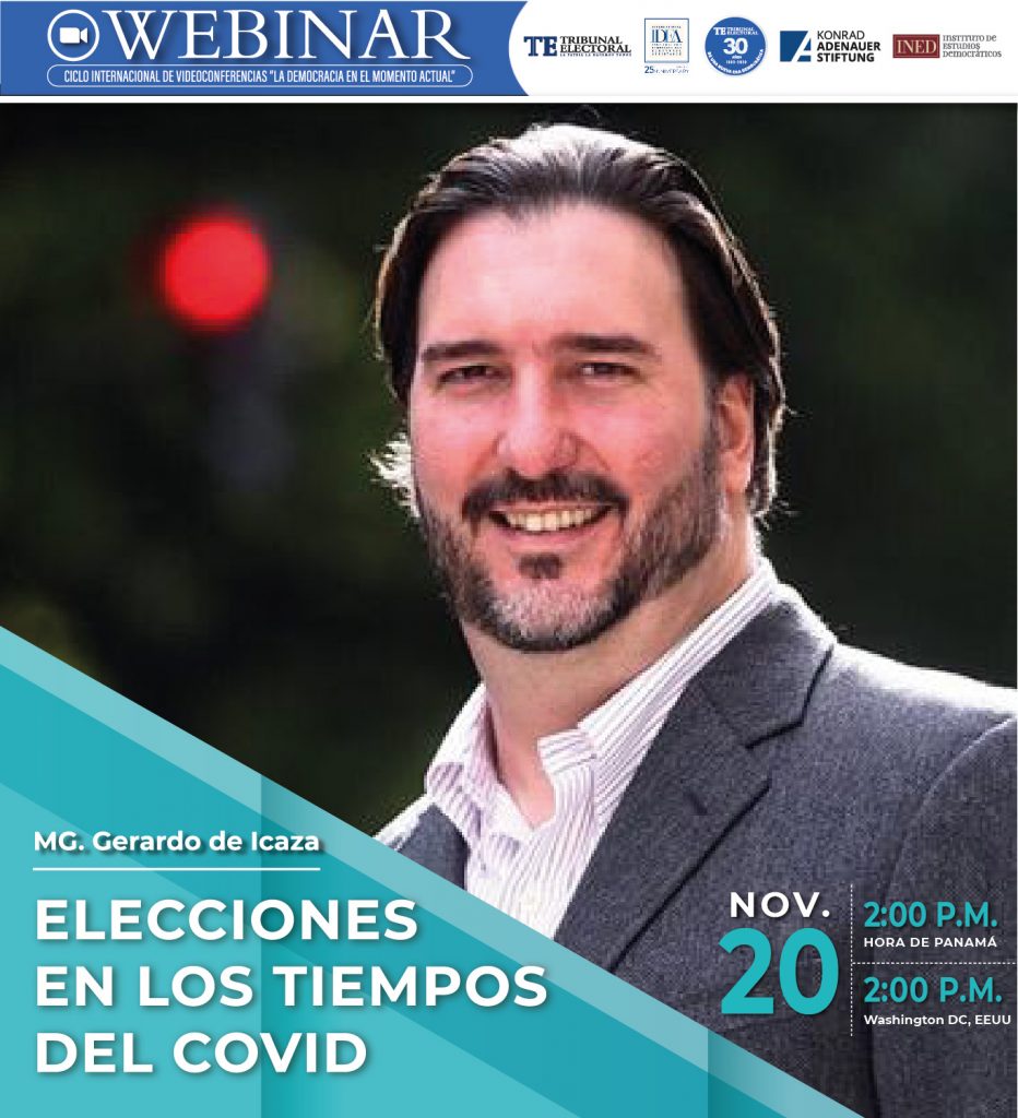 Décimo Sexto de los webinarios internacionales del ciclo La Democracia en el Momento Actual (julio-diciembre de 2020), que se realizan en ocasión de los 30 años de refundación del Tribunal Electoral de Panamá. Fue organizado por el INED del TRIBUNAL ELECTORAL, con apoyo de KAS e IDEA Internacional. El magíster de Icaza es Director del Departamento para la Cooperación y Observación Electoral (DECO). Secretaría para el Fortalecimiento de la Democracia (SFD) de la Organización de Estados Americanos (OEA). Es Licenciado en Derecho y cuenta con una Maestría en Relaciones Internacionales y Comunicaciones. Ha dado conferencias en las Universidades de Princeton, Georgetown y Science Po Paris, y cuenta con numerosas publicaciones académicas sobre democracia y sistemas electorales en distintos idiomas.