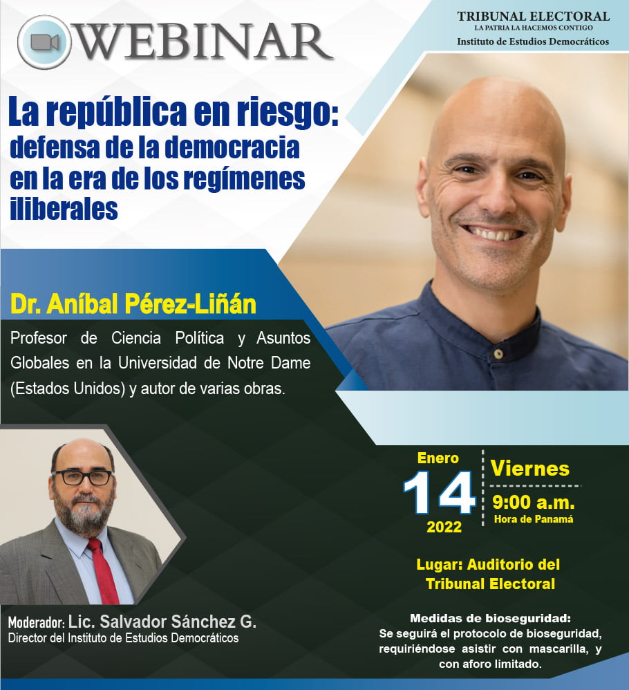 El Tribunal Electoral, a través de su Instituto de Estudios Democráticos, presenta la conferencia titulada “La república en riesgo: defensa de la democracia en la era de los regímenes iliberales” que es  dictada por el Dr. Aníbal Pérez-Liñán, profesor de Ciencia Política y Asuntos Globales en la Universidad de Notre Dame (Estados Unidos) e investigador especializado en temas de democratización, diseño institucional y Estado de derecho en perspectiva comparada.
