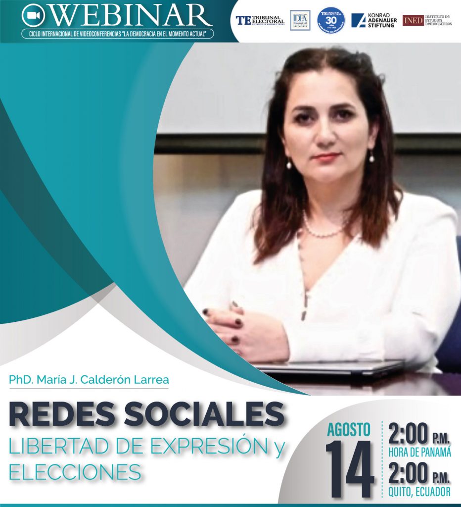 Cuarta de las conferencias del ciclo de webinarios internacionales sobre la democracia en el momento actual (julio-diciembre de 2020), que se realiza en ocasión de los 30 años de refundación del Tribunal Electoral de Panamá. Fue organizada por el INED del TRIBUNAL ELECTORAL, con apoyo de KAS e IDEA Internacional. La Doctora Calderón Larrea es Directora Ejecutiva del Instituto de la Democracia de Quito, Ecuador. Posee más de 10 años de experiencia tanto en docencia e investigación en temas relacionados al impacto del Internet en la sociedad. Ha trabajado en proyectos de comunicación y tecnología con la empresa privada y el sector público. Posee una licenciatura en Historia Comparada, una maestría en Comunicación por la Universidad de Maryland y un PhD en Estudios Políticos por Flacso-Ecuador. Su área de investigación es el uso de Internet y el ejercicio de la Política. Sus temas de investigación tienen que ver con ciberseguridad, el análisis de lenguaje natural y data mining, así como políticas públicas de Internet y la participación ciudadana.