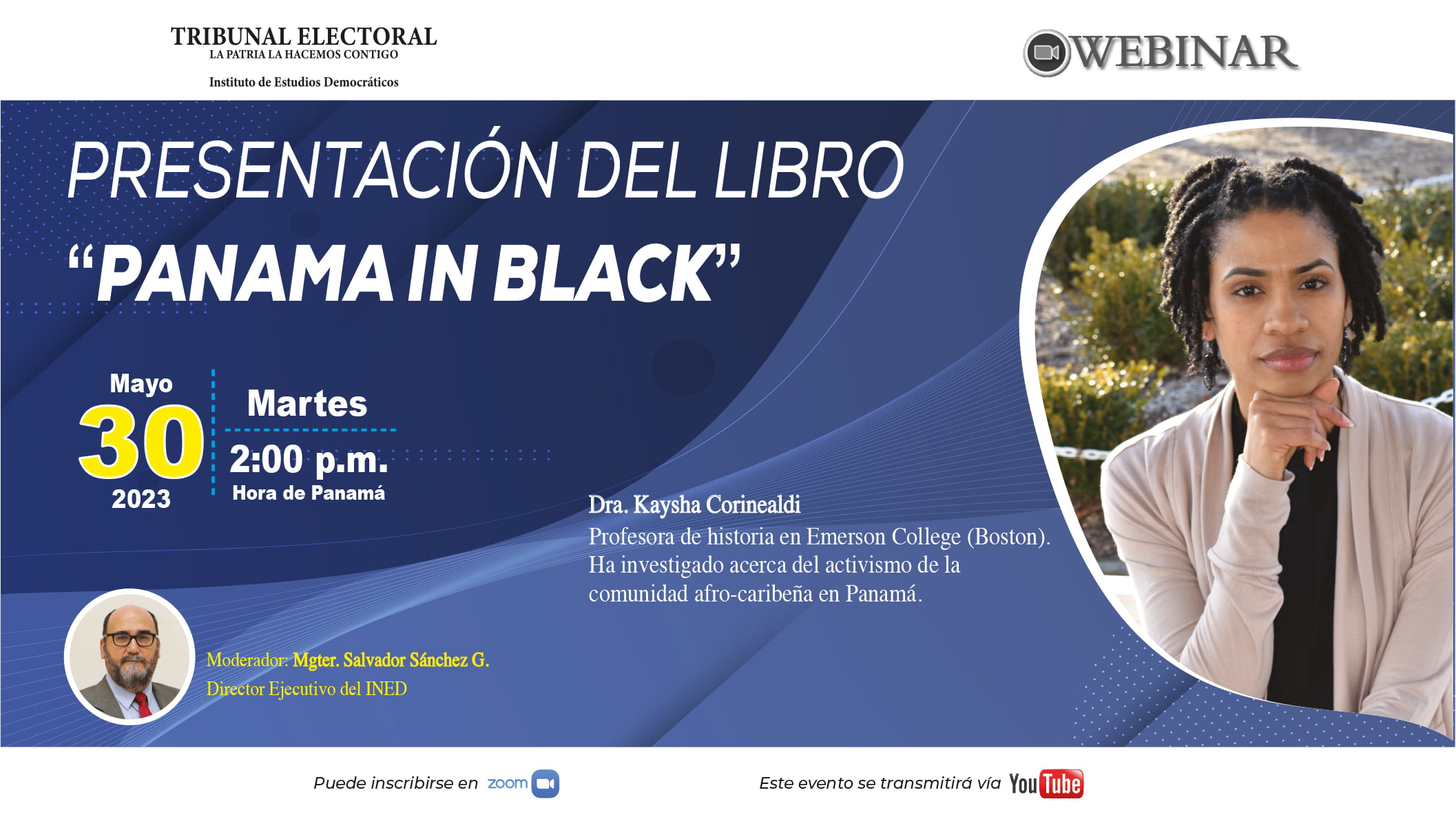 El Instituto de Estudios Democráticos del Tribunal Electoral se complace en invitarle a la presentación de «Panama in Black”, obra que trata sobre el activismo de la comunidad afro-caribeña en Panamá y de los miembros de la diáspora panameña en los Estados Unidos, destacando la manera en que estos grupos lidiaron con prácticas y legislaciones racistas y xenofóbicas. El libro será presentado por su autora, la Dra. Kaysha Corinealdi, quien es profesora de historia en Emerson College, en Boston. Como investigadora y docente se enfoca en historias de imperialismo, migración, feminismo, y activismo afro-diaspórico durante el siglo XX, en varias partes de las Américas. Este interesante webinar se realizará el martes 30 de mayo de 2023, a las 2:00 p.m. La moderación del evento estará a cargo del Mgter. Salvador Sánchez G., Director Ejecutivo del Instituto de Estudios Democráticos del Tribunal Electoral.