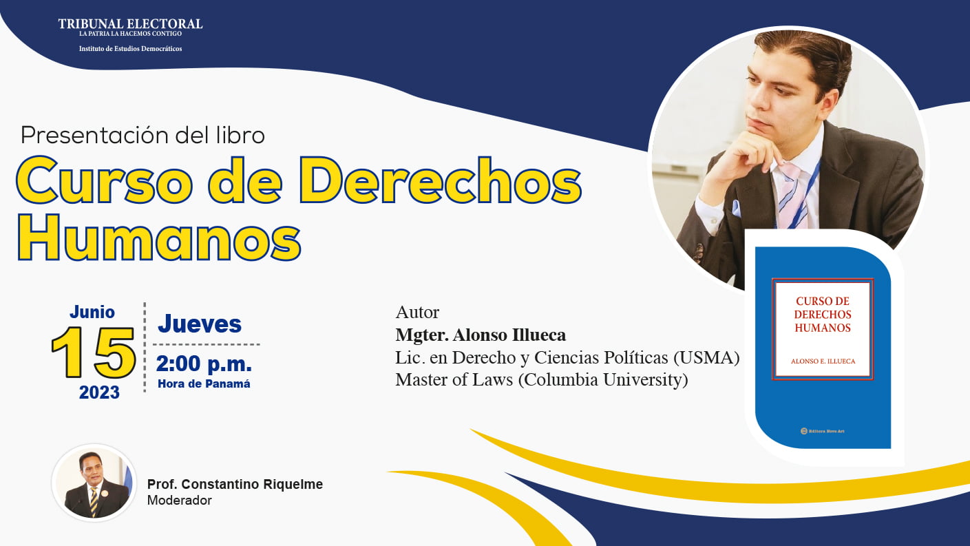 El Instituto de Estudios Democráticos del Tribunal Electoral se complace en invitarle a conocer el libro «Curso de Derechos Humanos”, que es presentado por su autor el magister Alonso Illueca, en un webinar que se realizará este jueves 15 de junio de 2023 a las 2:00 p.m. El autor es licenciado en Derecho y Ciencias Políticas de la Universidad Santa María La Antigua y Master of Laws de Columbia University. Es profesor asociado en la USMA, donde dicta cursos de Derecho Internacional Público y Derechos Humanos. La moderación del evento está a cargo del Prof. Constantino Riquelme, Jefe del Departamento de Investigación y Publicaciones del Instituto de Estudios Democráticos del Tribunal Electoral.