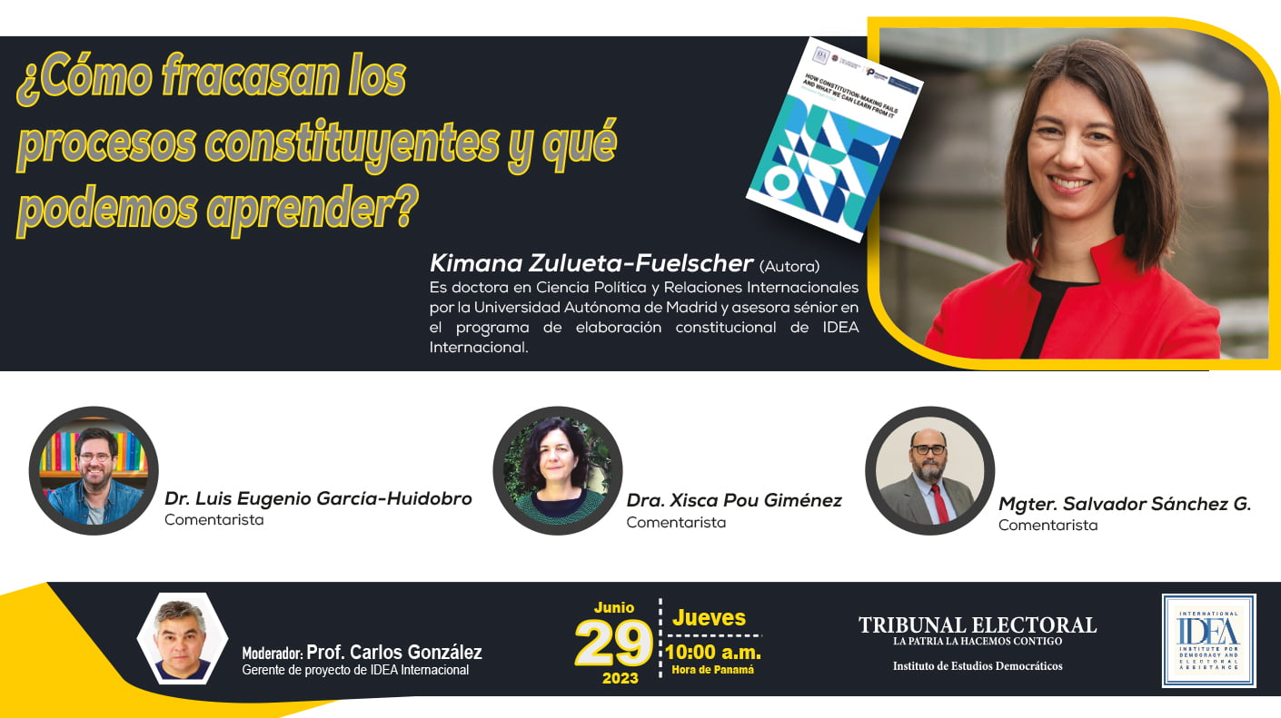 El pasado jueves 29 de junio de 2023, a las 10:00 a.m., el Instituto de Estudios Democráticos (INED) del Tribunal Electoral presentó la mesa redonda titulada «¿Cómo fracasan los procesos constituyentes y qué podemos aprender?». El evento contó con la participación de la autora del texto, Kimana Zulueta- Fülscher, quien es doctora en Ciencia Política y Relaciones Internacionales por la Universidad Autónoma de Madrid y asesora sénior en el programa de elaboración constitucional de IDEA Internacional. Además, participó como comentarista el Dr. Eugenio García-Huidobro, la Dra. Xisca Pou y el Mgter. Salvador Sánchez G., Director del Instituto de Estudios Democráticos del Tribunal Electoral. La moderación del evento estuvo a cargo del profesor Carlos González, gerente de proyecto de IDEA Internacional.