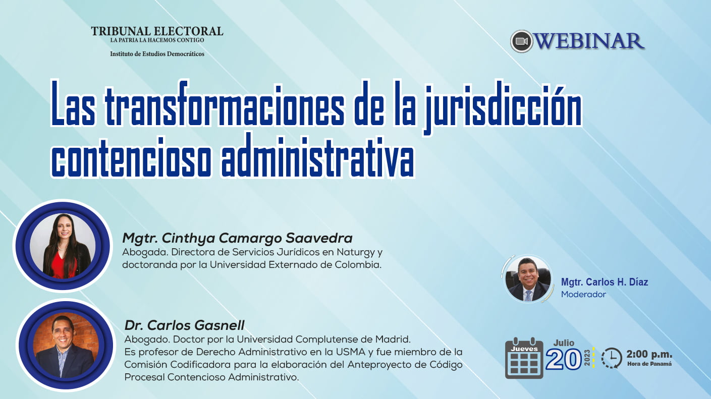 El Instituto de Estudios Democráticos (INED) del Tribunal Electoral presentó la mesa redonda titulada Las transformaciones de la jurisdicción contencioso administrativa, el pasado jueves 20 de julio de 2023, a las 2:00 p.m. El webinar contó con la participación de Cinthya Camargo, licenciada en Derecho y Ciencias Políticas y magíster en Derecho Mercantil, quien además es candidata doctoral por la Universidad Externado de Colombia y Directora de Servicios Jurídicos en Naturgy. Participó también el abogado Carlos Gasnell, que cuenta con una maestría en Derecho Administrativo, un doctorado de la Universidad Complutense de Madrid y quien fuera Presidente del Capítulo Panameño de Transparencia Internacional. El moderador de la mesa redonda fue el Mgtr. Carlos H. Díaz, Subdirector del INED.