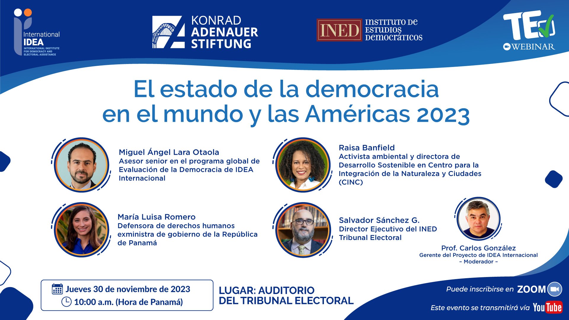 El informe será presentado por Miguel Ángel Lara Otaola, asesor senior en el programa global de Evaluación de la Democracia de IDEA Internacional y contará con los comentarios de María Luisa Romero, Raisa Banfield y Salvador Sánchez G. El moderador del evento será Carlos González, gerente de proyecto de IDEA Internacional.