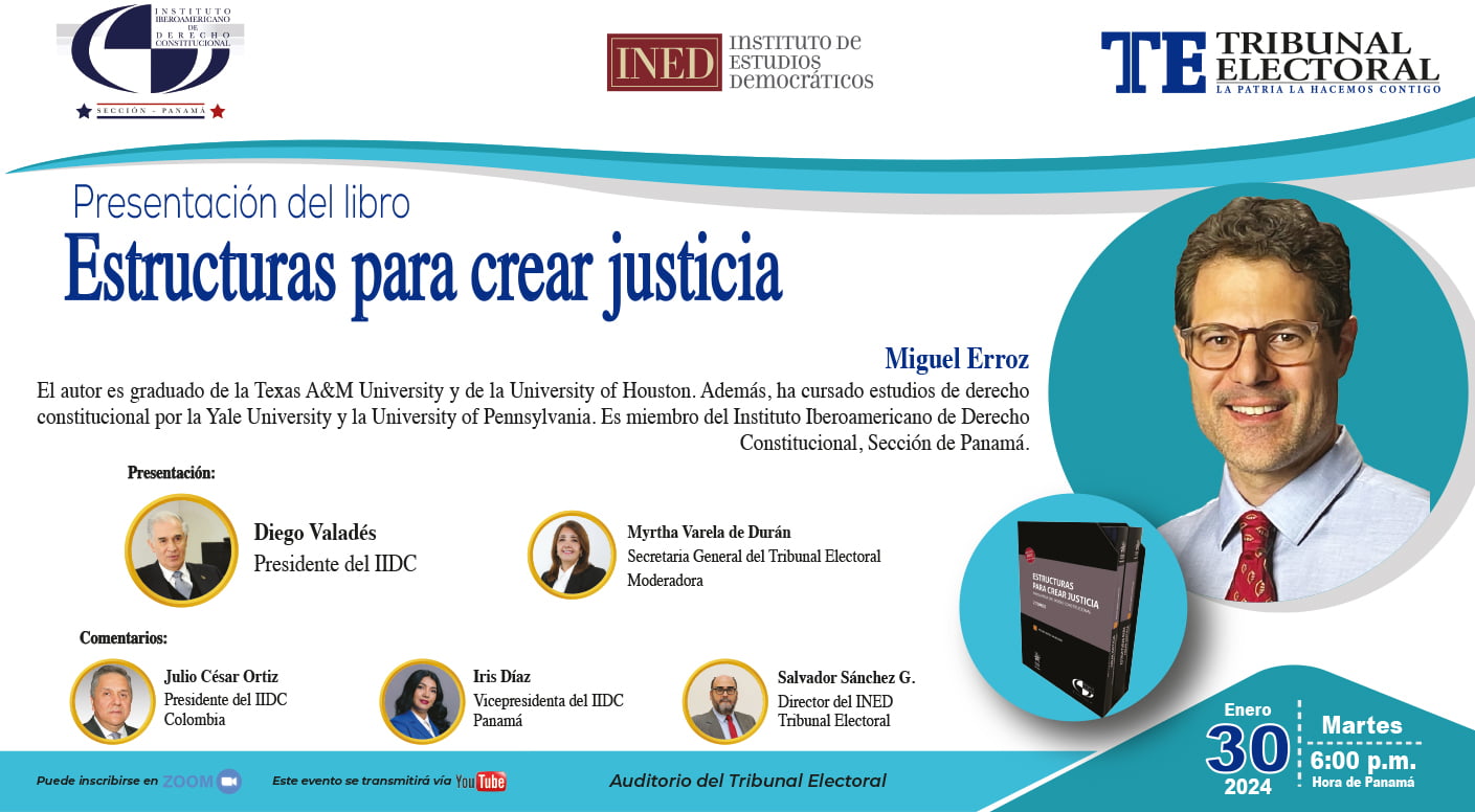 El Instituto Iberoamericano de Derecho Constitucional en colaboración con el Instituto de Estudios Democráticos (INED) del Tribunal Electoral llevaron a cabo la presentación del libro “Estructuras para crear justicia. Vanguardia del diseño constitucional” de Miguel Erroz. Este evento presencial se realizó el pasado martes 30 de enero de 2024, a las 6:00 p.m. (hora de Panamá) en el Auditorio del Tribunal Electoral.