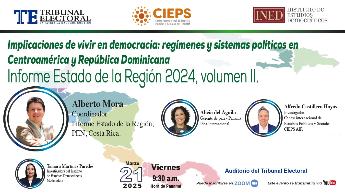 El Instituto de Estudios Democráticos – INED del Tribunal Electoral y elCentro Internacional de Estudios Políticos y Sociales – AIP Panamá,presentaron el informe Estado de la región 2024, el pasado viernes 21 demarzo de 2025, a las 9:30 a.m., en el Auditorio del Tribunal Electoral.